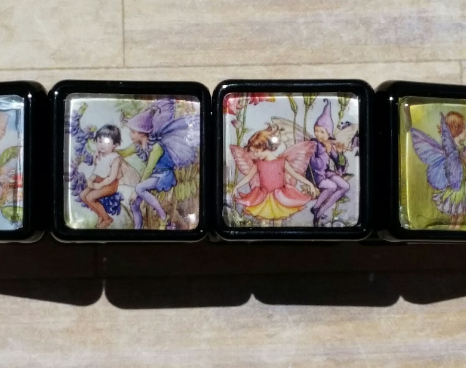This particular bracelet uses eight images. Apply Glaze and Glue to the flat side of the jewelers glass and place on the image sheet images you want to use in your project. Hold until they grab. Let dry and trim around the glass. Then place Fantastic Super Sticky Dots into the spots on the bracelet where the glass will go and then stick in the glass pieces.